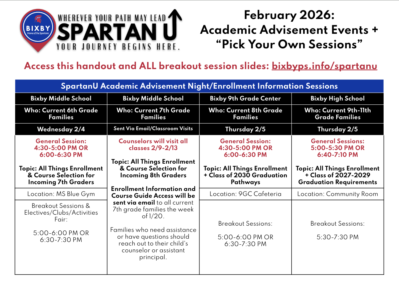 In the Fall, SpartanU sessions are focused on student success and information parents need for the CURRENT school year. The upcoming sessions this February are focused on enrollment and all things graduation requirements/course requests for the UPCOMING school year.
